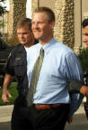 Saratoga Springs police officers escort "Super" Dell Schanze from the city's justice Court Friday. Schanze was sentenced to 10 days in jail after being found guilty of reckless driving and three seatbelt violations. (Donald W. Meyers / The Salt Lake Tribune) |